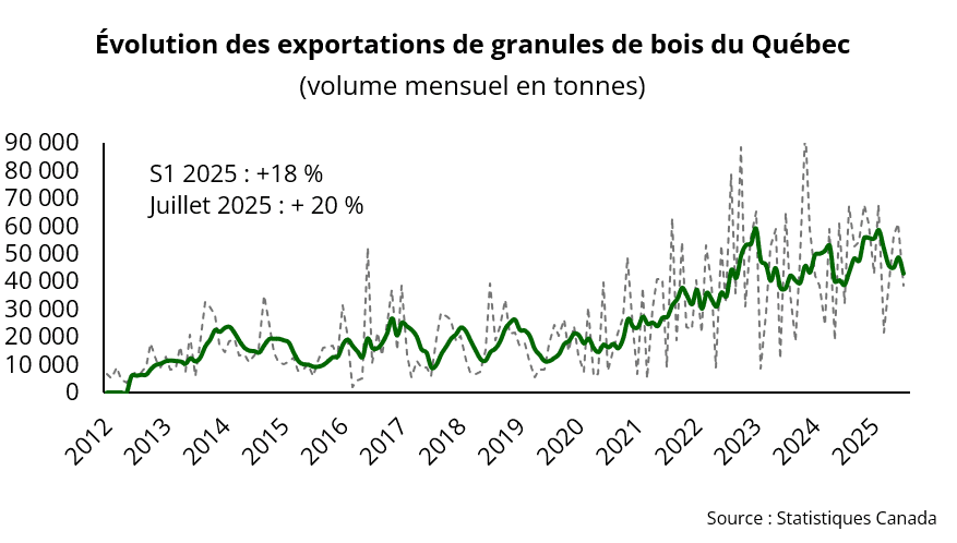 Les données récentes confirment cette dynamique : après six mois en 2025, les exportations québécoises de granules de bois ont augmenté de 18 %, atteignant 325 000 tonnes métriques anhydres (tma). À titre indicatif, elles se sont élevées à 579 000 tma en 2024 sur une année complète. Au rythme où vont les choses, les exportations pourraient atteindre 683 220 tma en 2025, une augmentation de 104 420 tma. Cette hausse équivaut à la capacité de production annuelle de l’usine Granulco à Sacré-Cœur.
