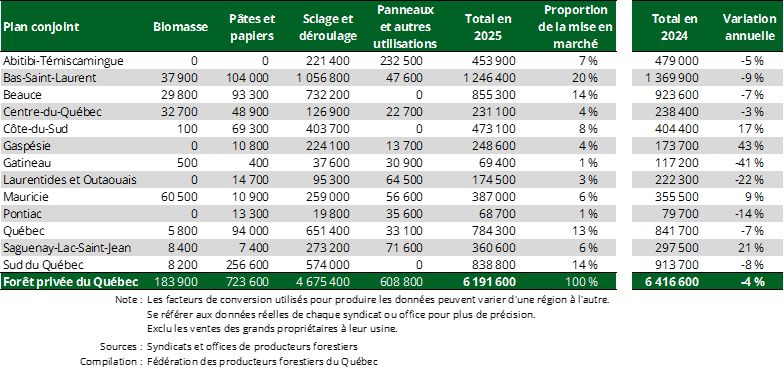 Entre janvier et décembre 2025, les producteurs forestiers visés par les 13 plans conjoints de producteurs de bois du Québec ont mis en marché environ 6,2 Mm³ de bois, toutes essences confondues. En 2025, 76 % des livraisons de bois en provenance de la forêt privée furent destinées aux usines de sciage, 10 % aux usines de panneaux et autres utilisations, 12 % aux usines de pâtes et papiers ainsi que 3 % aux usines de biomasse.