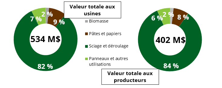 La valeur du bois mis en marché en 2025 est évaluée à 534 M$ (-4.4 M$), ce qui représente une baisse de -0,8 % par rapport à l’année précédente. En 2025, le revenu total des producteurs, soit la valeur du bois livré à l’usine moins la somme consacrée au transport et aux contributions aux plans conjoints, s’est chiffré à 402 M$ (+1,1 M$), en hausse de 0,3 %.