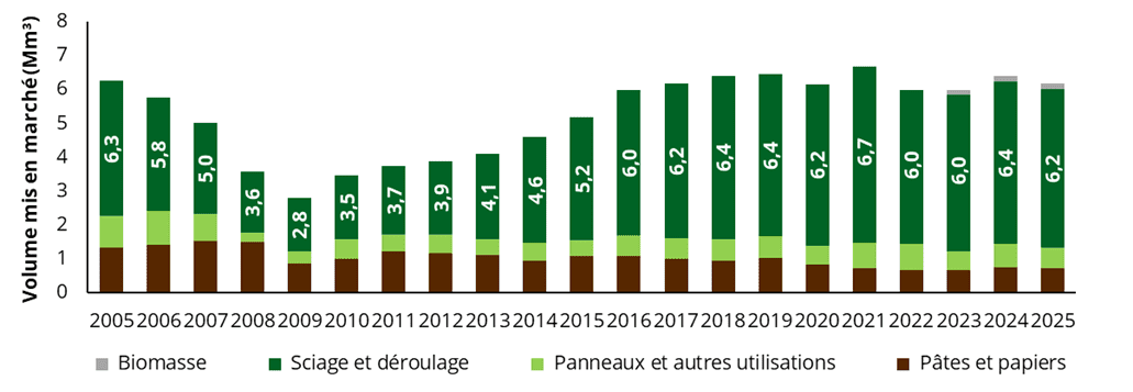 Globalement, 72 % du bois mis en marché provenait d’essences résineuses alors que les feuillus représentaient 28 % du volume des livraisons. Le volume total mis en marché a baissé de 3,5 % par rapport à 2024. Ces volumes ne tiennent pas compte de la récolte de bois de chauffage estimée à 1,7 Mm³ chaque année.