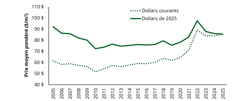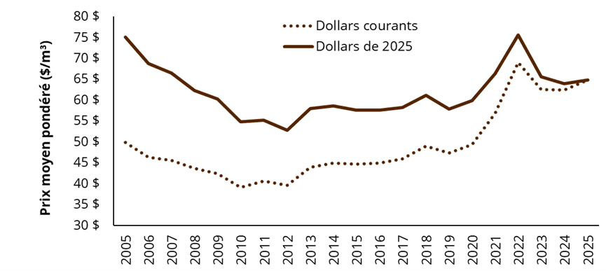 Évolution du prix moyen pondéré payé pour le bois de la forêt privée