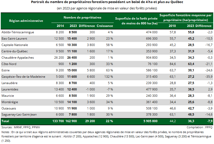 Toutes choses étant égales par ailleurs, il est aussi intéressant de constater que la superficie moyenne détenue par propriétaire forestier est inférieure de près de 8 ha en 2023, passant en moyenne à 36,3 ha. La progression du nombre de propriétaires forestiers dans certaines régions diminue cette estimation, particulièrement en Gaspésie, en Estrie et sur la Côte-Nord.