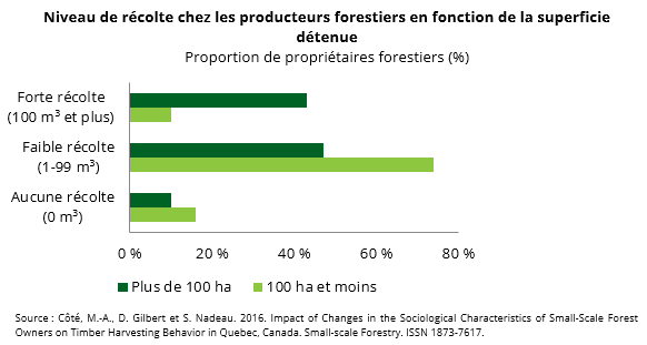 En effet, la littérature scientifique révèle que la réduction de la superficie détenue diminue la vue utilitaire du boisé par leurs propriétaires, et donc l’activité forestière et les niveaux de récolte. Au contraire, les propriétaires qui détiennent de plus grandes superficies forestières ont plus d’options pour étaler leurs activités d’aménagement dans le temps et dans l’espace, ce qui leur confère un plus grand spectre d’activités de récolte, de loisirs et de conservation que les plus petits propriétaires. Au Québec, les propriétaires de boisés détenant des superficies forestières supérieures à 100 hectares récoltent davantage de bois que ceux détenant de plus petites superficies. Conséquemment, on peut anticiper qu’un morcellement des lots boisés pourrait nuire à la mobilisation du bois des forêts privées.