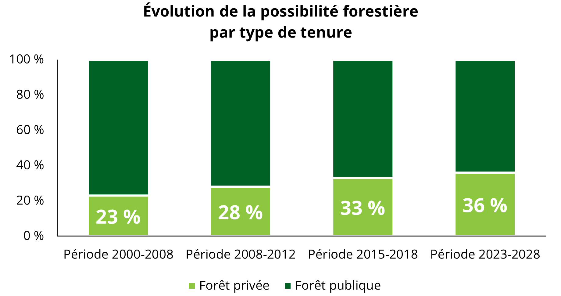 Les raisons qui expliquent ces gains de possibilité forestière sont de deux ordres. Premièrement, la hausse structurelle du volume de bois sur pied[2] accroît le capital en croissance et la possibilité forestière. Deuxièmement, la maturité atteinte par une grande partie de la forêt privée permet de scénariser la récolte de volumes conjoncturels.