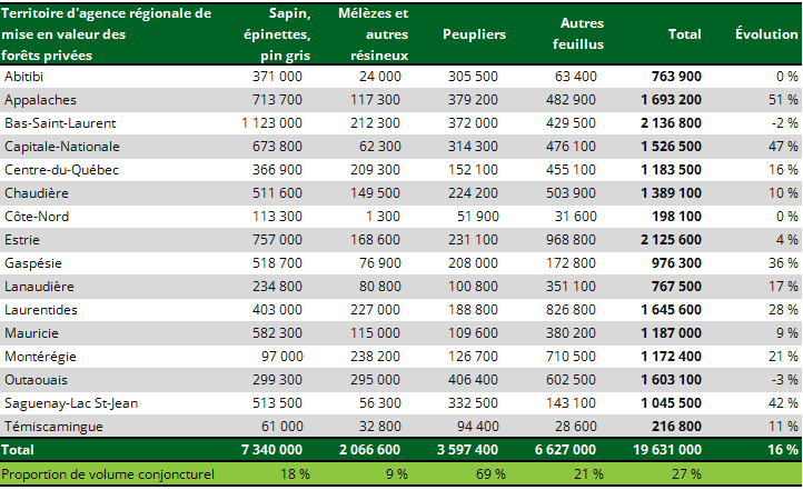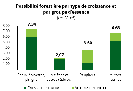 La possibilité forestière s’accroît principalement pour le groupe d’essences sapin-épinettes-pin gris (+1 656 000 m³), mais également pour les peupliers (+727 000 m³) et les feuillus durs (+393 000 m³). Au contraire, le groupe mélèze et autres résineux (-96 000 m³) connaît une décroissance peu significative (-4,5 %). Les possibilités forestières s’accroissent presque partout, sauf dans 3 territoires d’agence (Abitibi, Bas-Saint-Laurent et Outaouais). Les hausses sont particulièrement élevées pour les territoires d’agence des Appalaches (+51 %), de la Capitale-Nationale (+47 %), du Saguenay-Lac-Saint-Jean (+42 %) et de la Gaspésie (+36 %).
