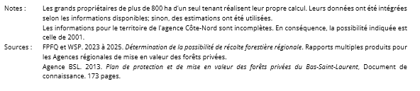 [1] Les données nécessaires pour réviser le calcul sur la Côte-Nord ne sont pas disponibles, tandis que le Bas-Saint-Laurent a procédé de manière distincte. Consultez notre infolettre de juillet 2023 pour un aperçu détaillé de la méthodologie de calcul de la possibilité forestière et de ses applications.