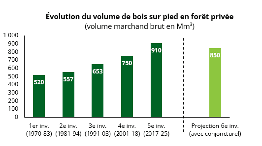 Depuis une cinquantaine d’années, le MRNF documente l’évolution du volume de bois sur pied. Les résultats parlent d’eux-mêmes. En forêt privée, le volume est passé de 520 Mm³ au premier inventaire à 910 Mm³ au cinquième, soit une hausse de 75 %. La croissance atteint même 160 Mm³ entre le quatrième inventaire (2001-2018) et le cinquième (2017-2025), soit une hausse de 21 %.