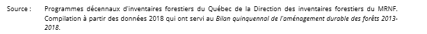 [4] Mise en garde : le mélèze est inclus dans le groupe sapin-épinettes-pin gris en forêt publique, tandis qu’il est regroupé avec les autres résineux en forêt privée. Cette classification distincte peut créer certains écarts marginaux lors de l’interprétation des résultats par groupe d’essences.