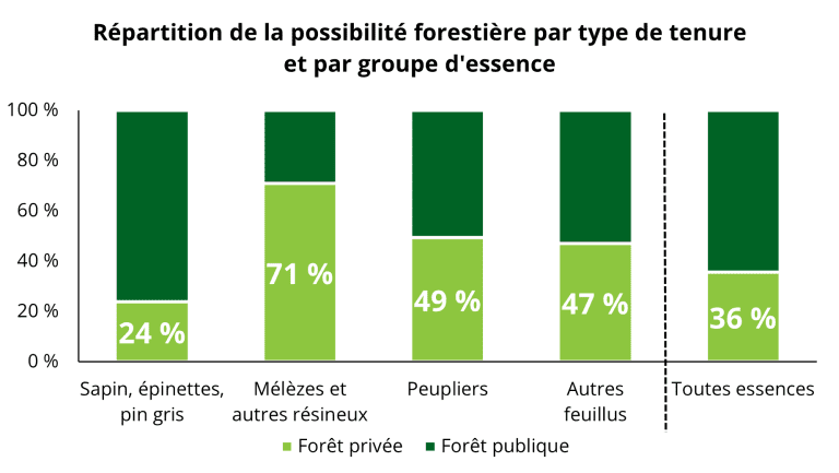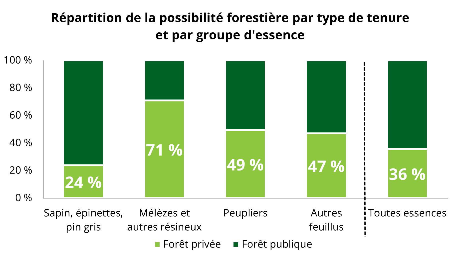Nous estimons ainsi qu’environ 36 % de la possibilité de récolte se trouve maintenant en forêt privée. Comme présenté dans les graphiques suivants, cette portion est évidemment variable selon le groupe d’essences. En effet, la moitié de la possibilité forestière des feuillus et la majorité de celle des autres résineux[4] se trouvent en territoire privé.