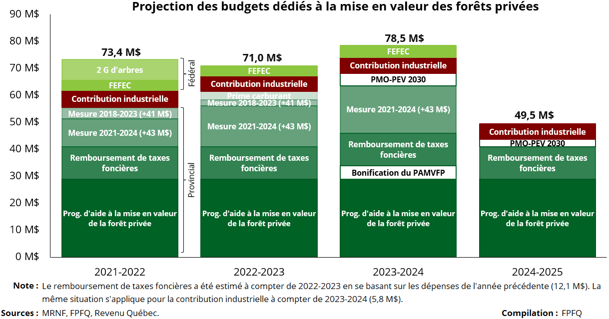 En 2023-2024, nous anticipons que les budgets d’aide à la mise en valeur des forêts privées atteindront 78,5 M$ (+8,5 M$). Cela équivaut à une hausse de 11 %, soit supérieure à l’inflation. Pour ce faire, le MRNF a procédé à deux annonces de budgets supplémentaires temporaires :
