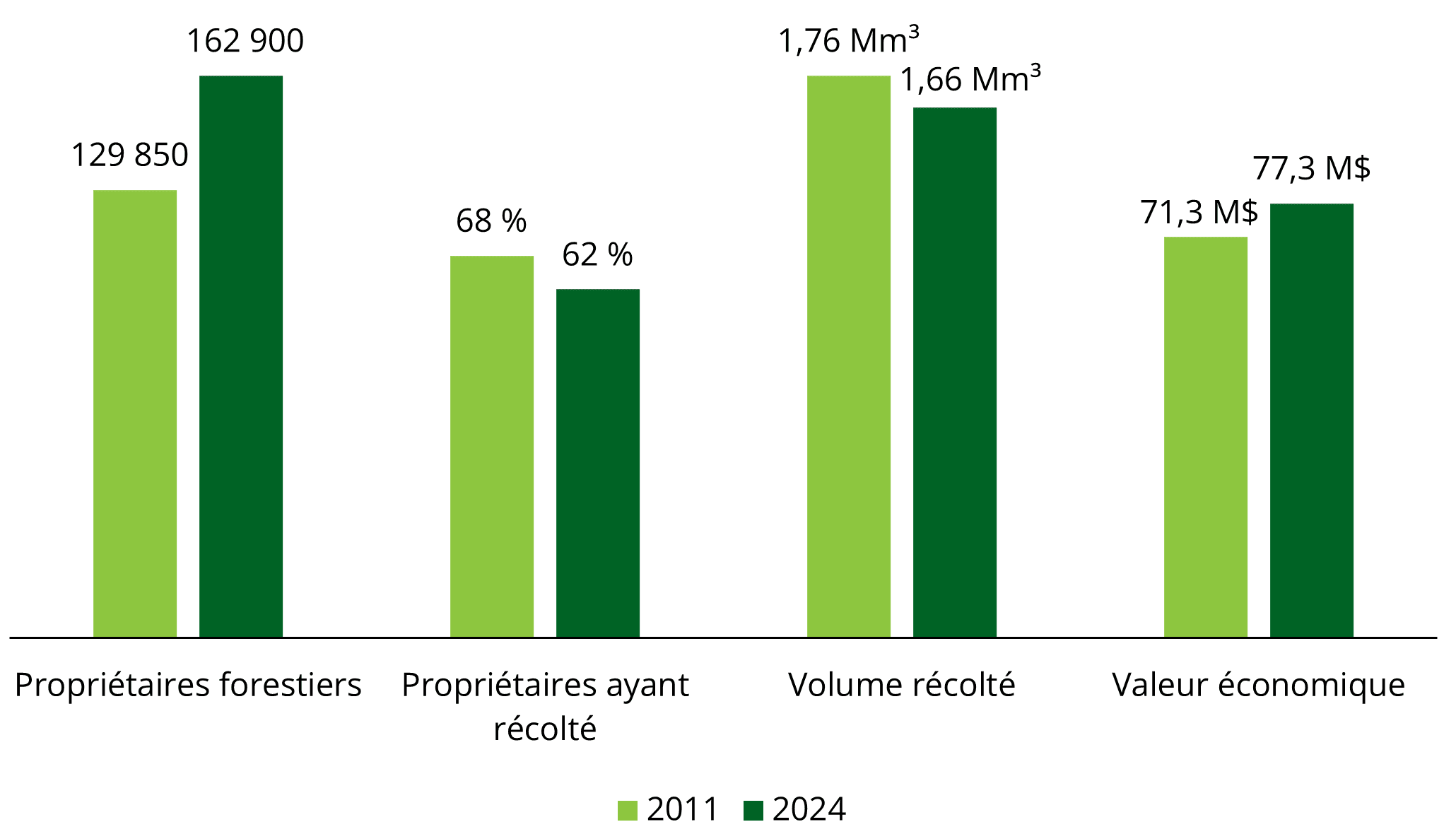 La FPFQ estime que la valeur de la récolte de bois de chauffage des forêts privées du Québec s’est chiffrée au moins à 77,3 M$ en 2024, comparativement à 71,3 M$ en 2011. Nous évaluons cette valeur en attribuant au bois de chauffage le prix moyen du bois à pâte de feuillus au Québec empilé au chemin du producteur, en excluant le peuplier. Cette valeur constitue une estimation minimale, basée sur un prix de référence du bois à pâte de feuillus empilé au chemin du producteur. Les prix du bois de chauffage non transformé sur certains marchés locaux peuvent être supérieurs à ce référentiel, sans que ces écarts puissent être quantifiés à partir des données disponibles.