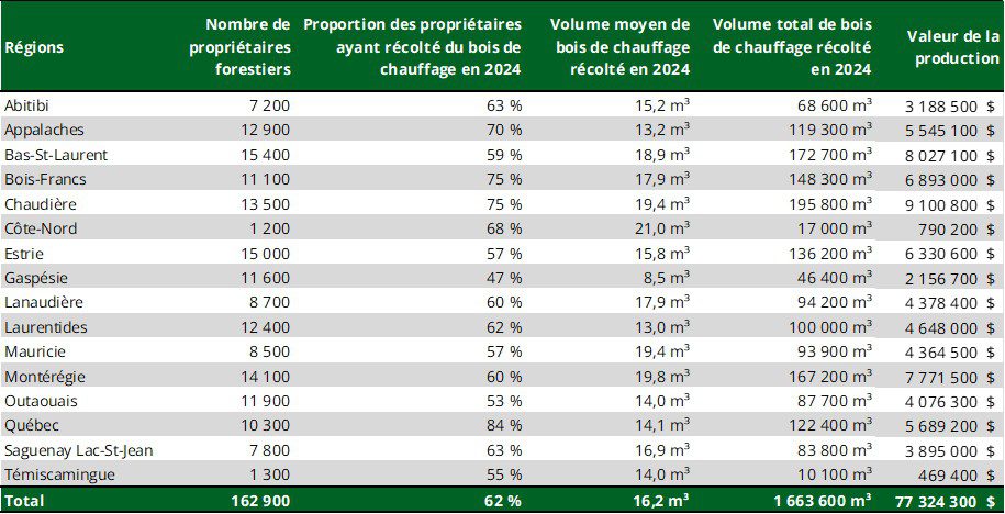 Le bois de chauffage demeure une motivation importante pour posséder un lot boisé en forêt privée. Selon la plus récente enquête, 71 % des propriétaires forestiers québécois indiquent qu’ils possèdent leur boisé pour y récolter du bois de chauffage, une proportion comparable à 2012 (75 %), avec des écarts régionaux marqués (60 % au Témiscamingue contre 83 % en Chaudière). Cette réalité s’observe depuis longtemps : dès 1999, entre 65 % et 79 % des propriétaires, selon les régions, citaient le bois de chauffage comme motif de possession.