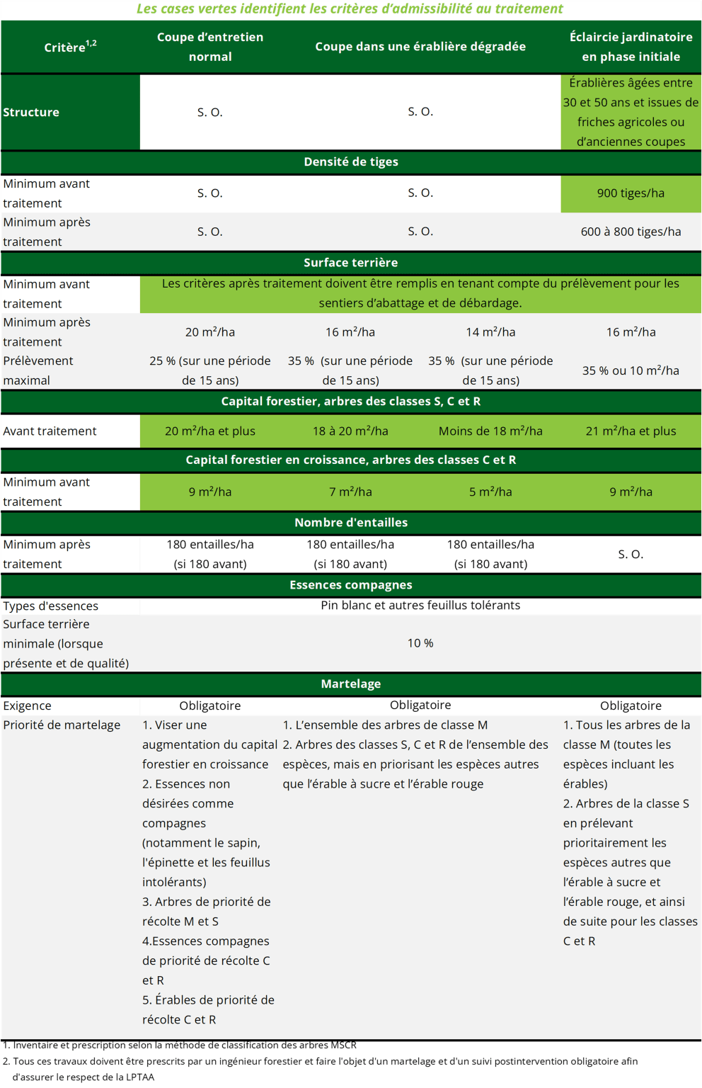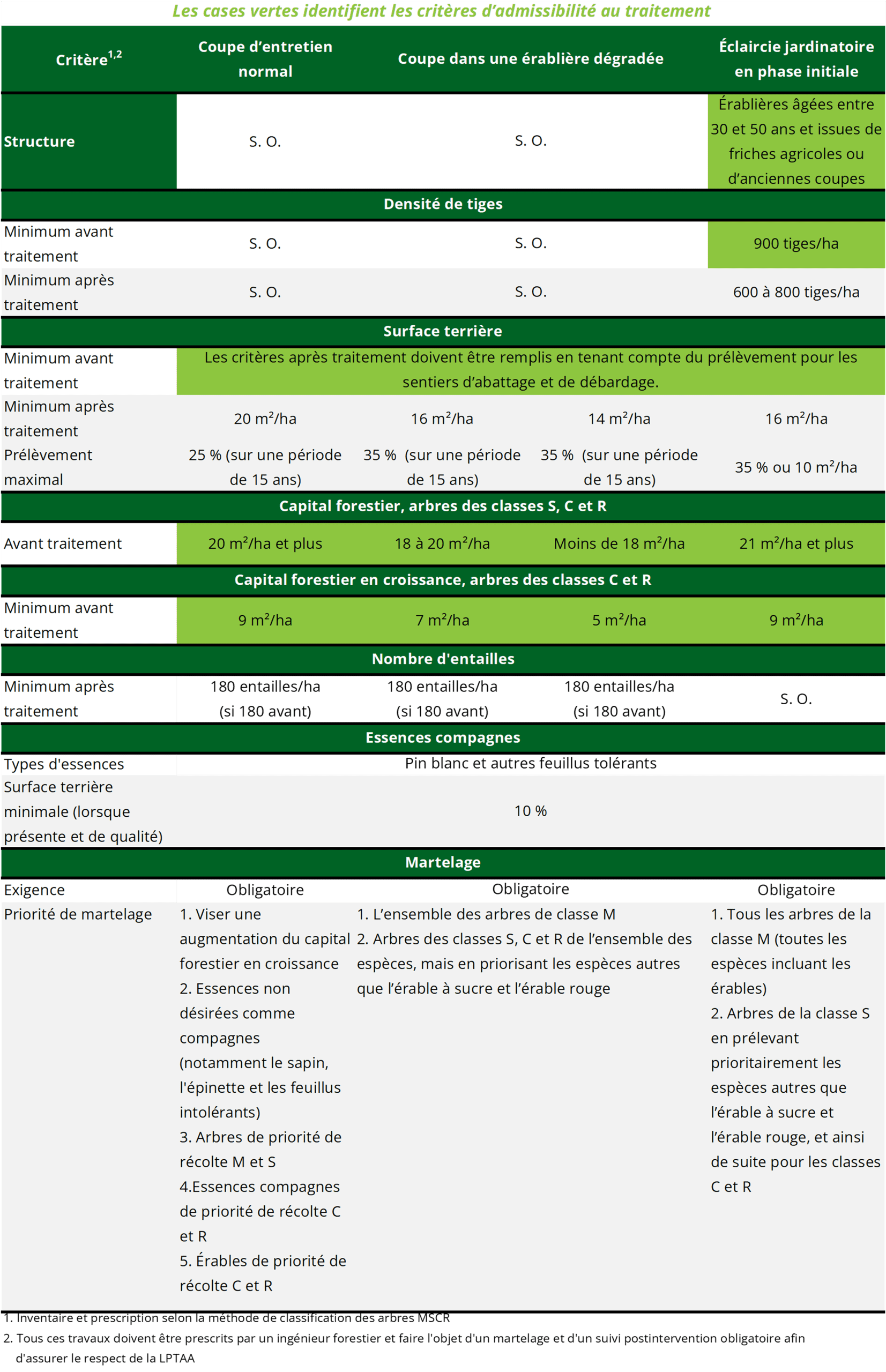 Le prélèvement des tiges, après martelage obligatoire, doit viser en priorité tous les arbres de la classe M (toutes les espèces incluant les érables), puis les arbres de la classe S en prélevant prioritairement les espèces autres que l’érable à sucre et l’érable rouge, et ainsi de suite pour les classes C et R. De plus, la surface terrière minimale après traitement sera de 16 m²/ha, pour une population de 600 à 800 tiges par hectare, avec un prélèvement maximal de 10 m²/ha ou de 35 % de la surface terrière.