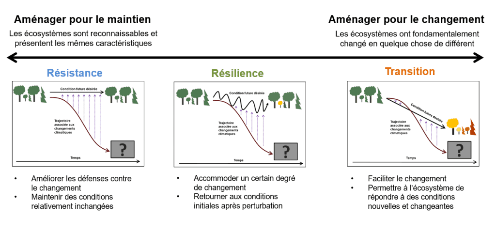 Les stratégies de résistance font appel à des traitements sylvicoles qui améliorent les défenses de la forêt contre les changements ou qui défendent directement la forêt contre les perturbations afin de maintenir des conditions relativement inchangées. Les stratégies de résilience impliquent, quant à elles, l’utilisation de traitements sylvicoles qui permettent un certain degré de changement dans les peuplements, mais qui encouragent le retour à un état antérieur ou à des conditions de référence souhaitées après une perturbation. Pour leur part, les stratégies de transition s’appuient sur des actions qui adaptent intentionnellement les peuplements forestiers aux changements et permettent aux écosystèmes de répondre de façon adaptative aux conditions nouvelles et changeantes.